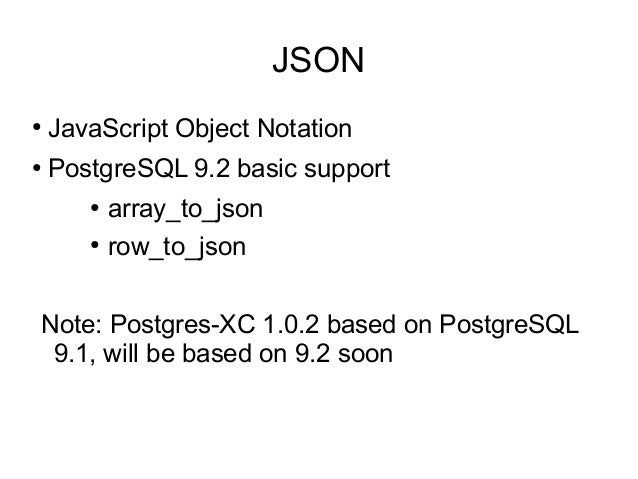 Configuration settings mattermost 5.11 documentation. Configuration settings¶. Mattermost configuration settings are maintained in the configuration file config.Json, located in the mattermost/config directory. You can modify the configuration file using the system console, or by using a text editor to modify it directly. Postgresql general extract elements from json array and. Extract elements from json array and return them as concatenated string previous topic next topic . Postgresql 9.4 how to convert json array elements into. Database research & development full demonstration about, how to convert json array into postgresql string array using jsonb_array_elements and string_agg functions. Postgresql documentation 11 8.14. Json types. Json data types are for storing json (javascript object notation) data, as specified in rfc 7159. Such data can also be stored as text, but the json data types have the advantage of enforcing that each stored value is valid according to the json rules. There are also assorted jsonspecific functions. Postgresql 9.4 how to convert json array elements into. Database research & development full demonstration about, how to convert json array into postgresql string array using jsonb_array_elements and string_agg functions. Postgresql vs. Ms sql server. Postgresql vs. Ms sql server. A comparison of two relational databases from the point of view of a data analyst. Knex.Js a sql query builder for javascript. Knex.Js is a "batteries included" sql query builder for postgres, mssql, mysql, mariadb, sqlite3, oracle, and amazon redshift designed to be flexible, portable, and fun to use. It features both traditional node style callbacks as well as a promise interface for cleaner async flow control, a stream interface, full featured query and schema builders, transaction support (with savepoints.
